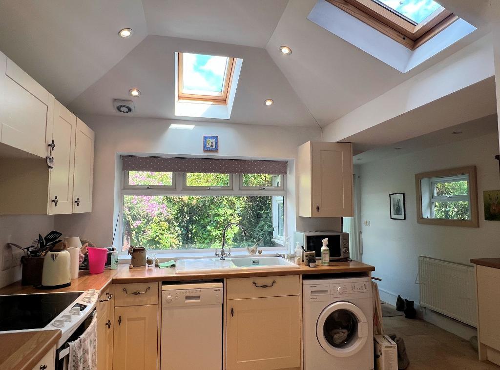 15'3" x 13'7" (4.66m x 4.15m) Part-vaulted ceiling with Velux windows and window overlooking the rear garden. Range of timber-effect work surfaces with inset white sink unit with mixer tap. Cupboards and drawers and matching wall units. Space and plumbing for washing machine. Space for slimline dishwasher. Recess for cooker. Space for fridge/freezer. Household cupboard housing Alpha gas-fired boiler providing hot water and central heating. French doors to rear garden.