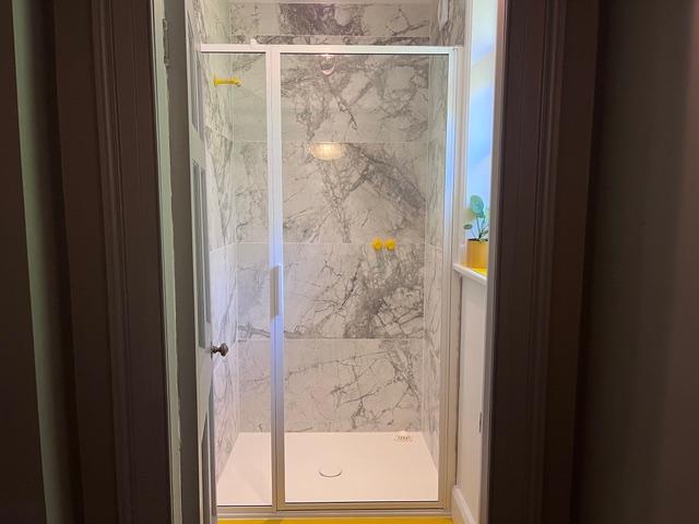 Shower Room 1 - White marble-effect shower area with Vola shower fittings and head.