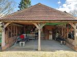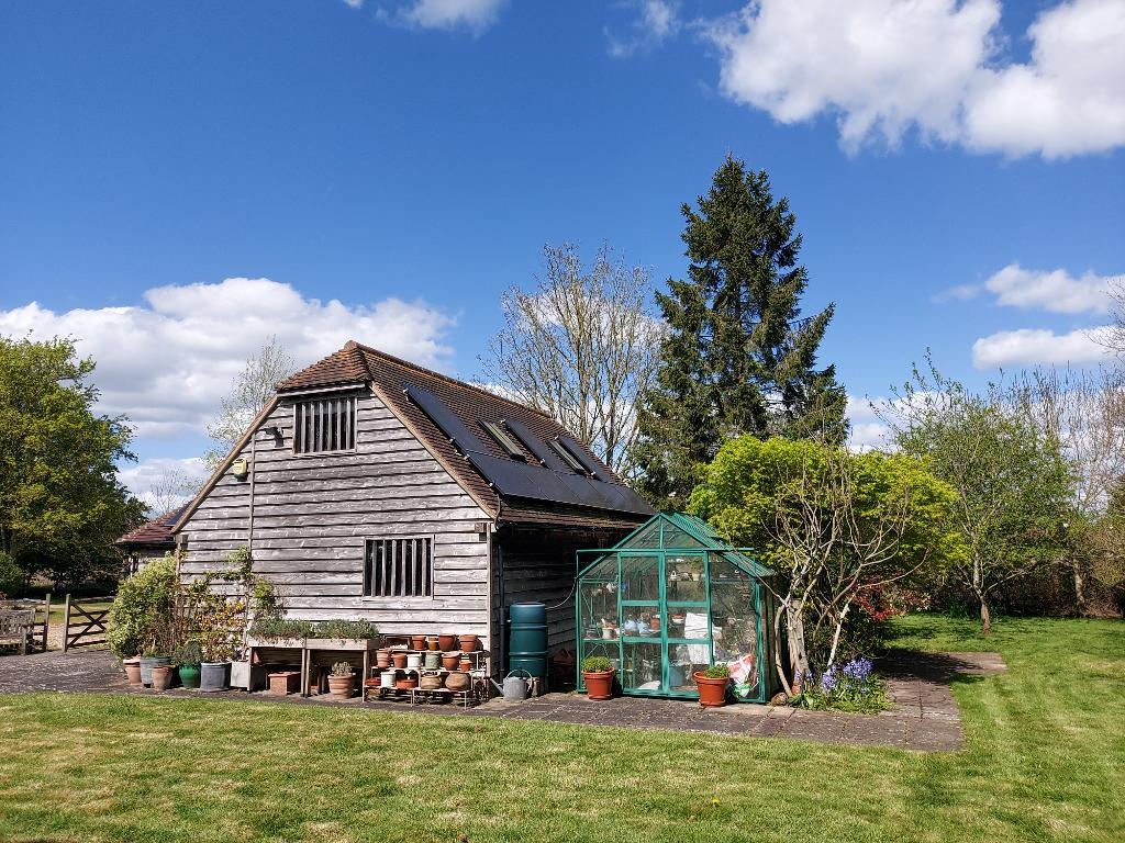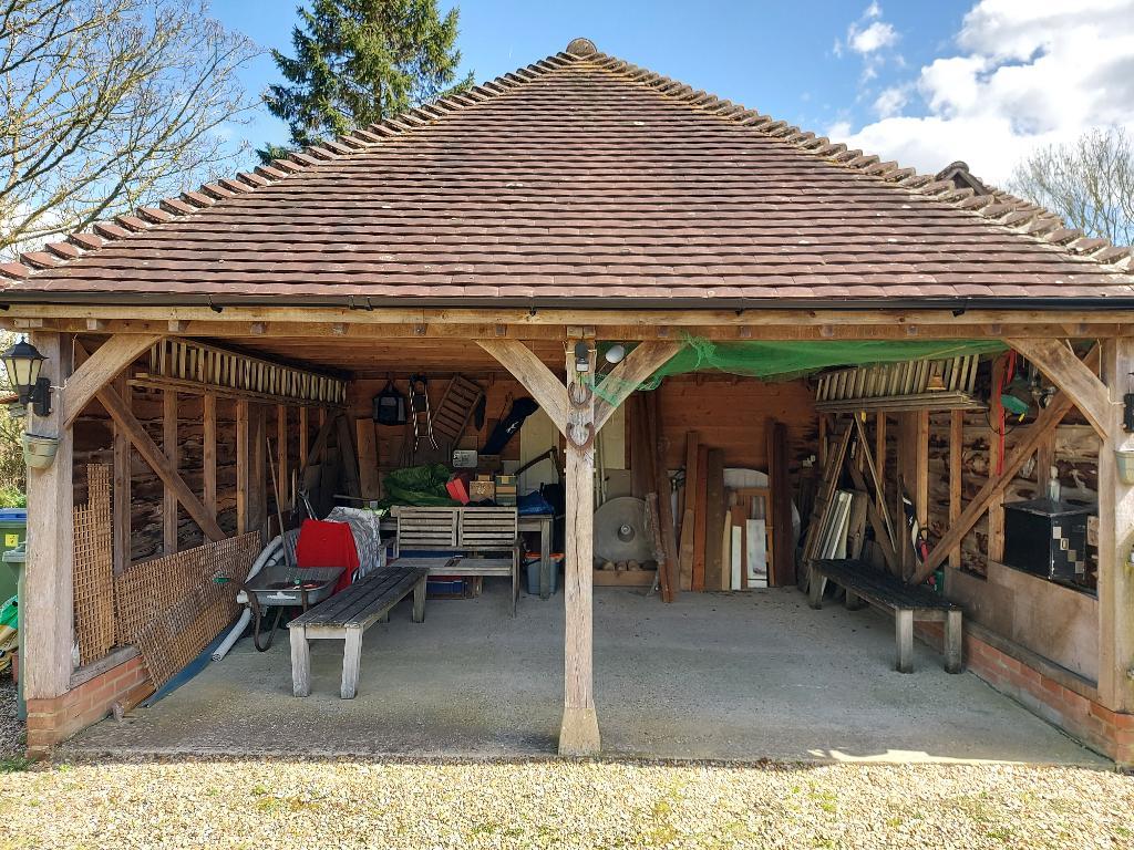 Substantial Detached Outbuilding - Comprising Double Carport: 17'0" x 17'5" (5.45m x 5.32m) with EV charger point, oak-framed, power connected, mezzanine storage area. Photovoltaic cells on two roof slopes.
