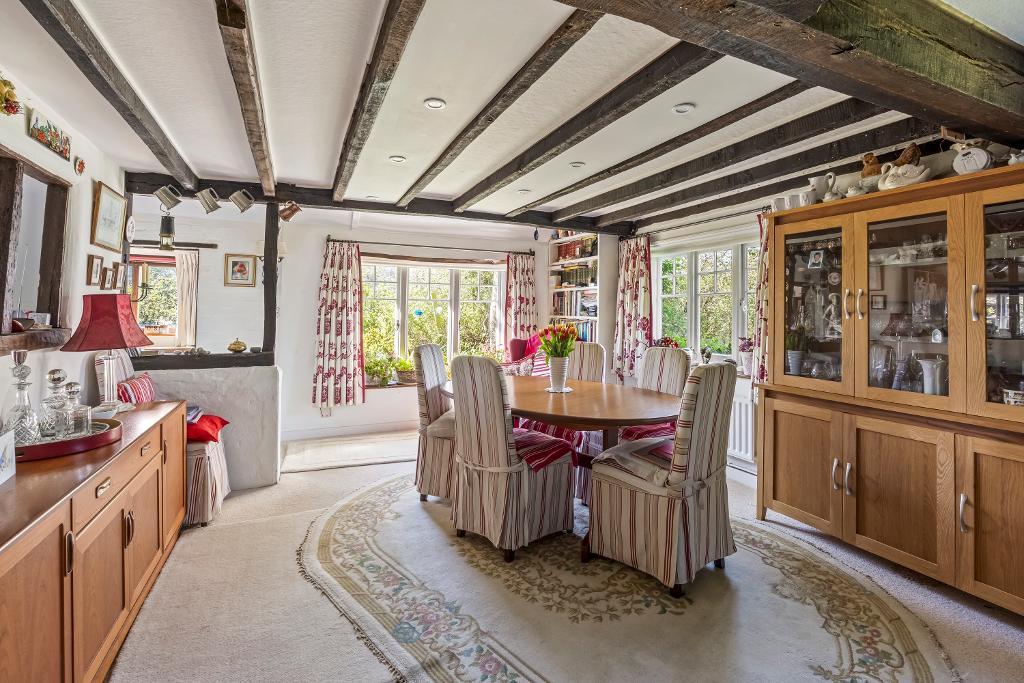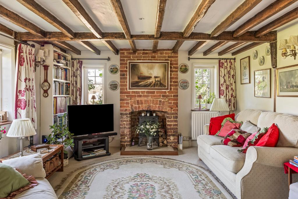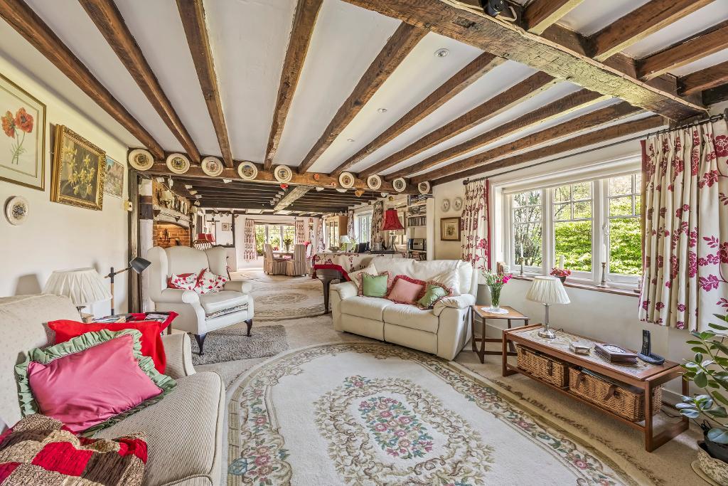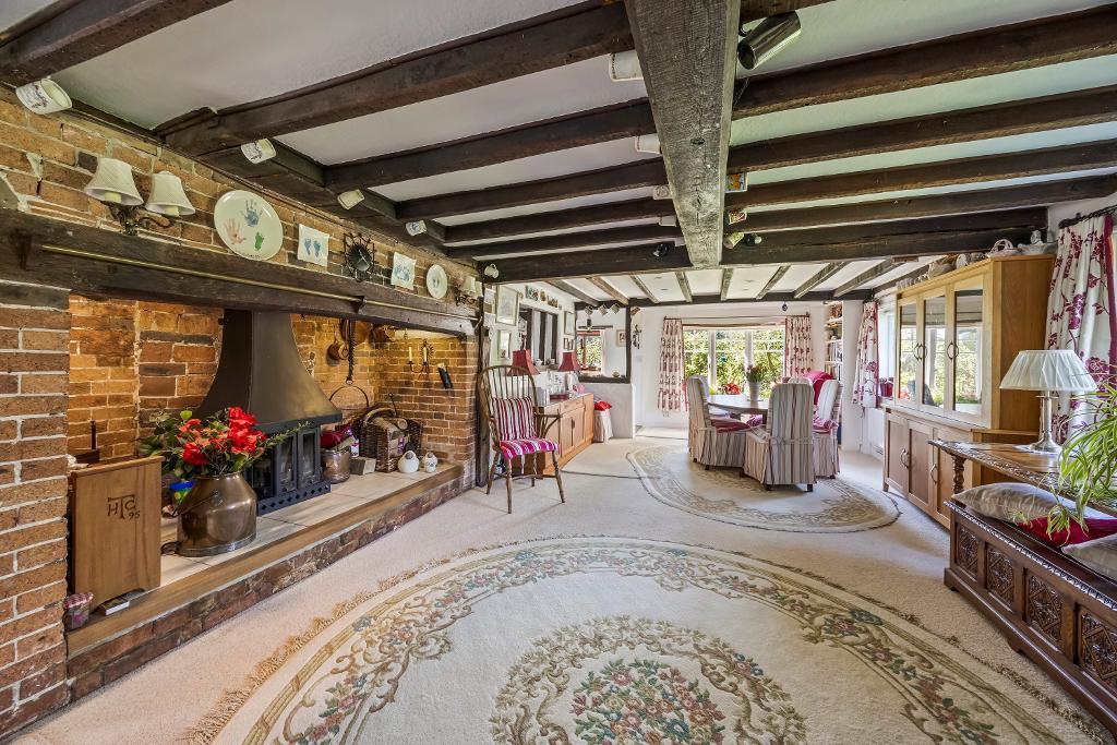 Open-Plan Living Space - 44'10" x 16'2" (12.44m x 4.93m) Triple aspect and overlooking the gardens with a wealth of exposed timbering. The central feature is a fine Inglenook fireplace with stout timber bressumer and fitted wood-burning stove on raised tiled hearth and flanked by the sitting area with exposed brick fireplace and fitted wood burner and dining section (double aspect).