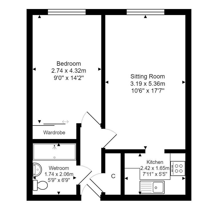 Double Bedroom - 14'2" x 9' (4.32m x 2.74m) Double-glazed window. Night storage heater. Recessed wardrobe cupboard with sliding doors.