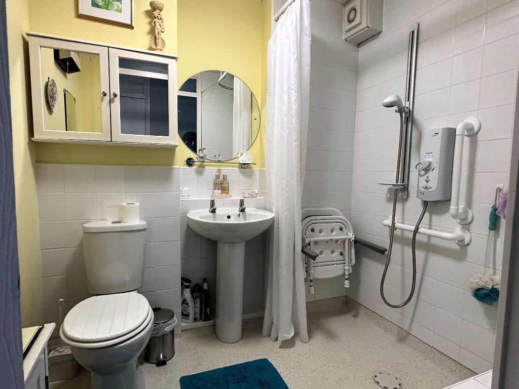 Wet Room / WC - Walk-in shower area with Mira electric shower and fitted seat. Pedestal washbasin. Low level WC. Part-tiled walls. Dimplex electric heater. Extractor fan.