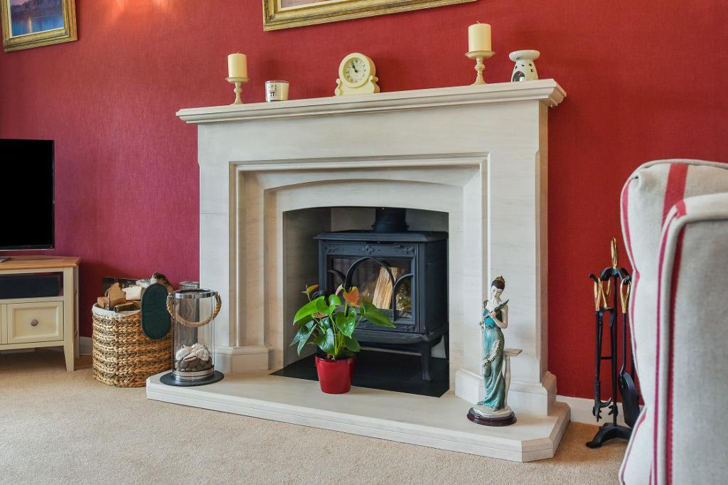 Sitting Room - 25'0" x 11'4" (7.62m x 3.45m) Double aspect with bow window and French doors opening and overlooking the rear garden. Fine polished stone fireplace with raised hearth and fitted wood-burning stove. Three wall light points. Radiator shelving.