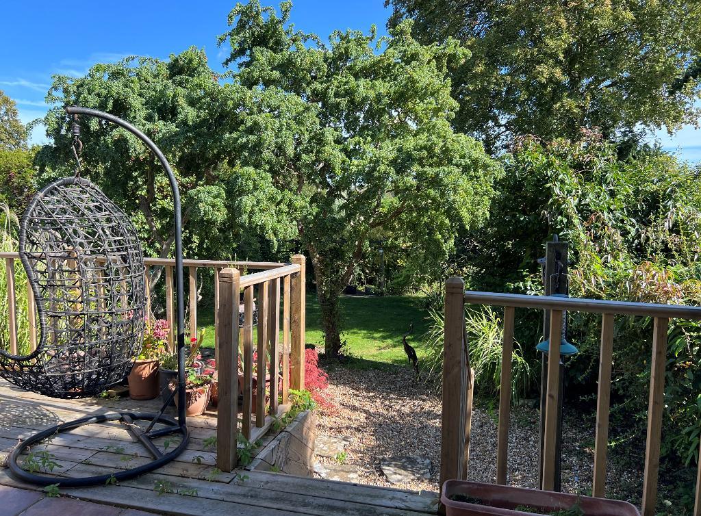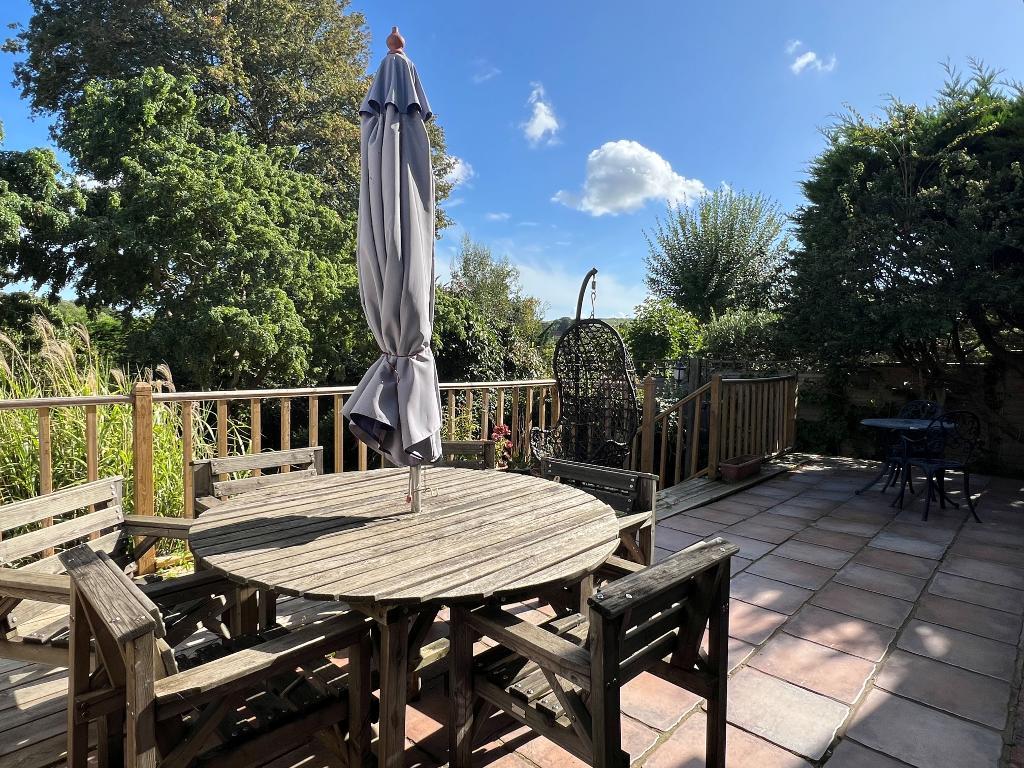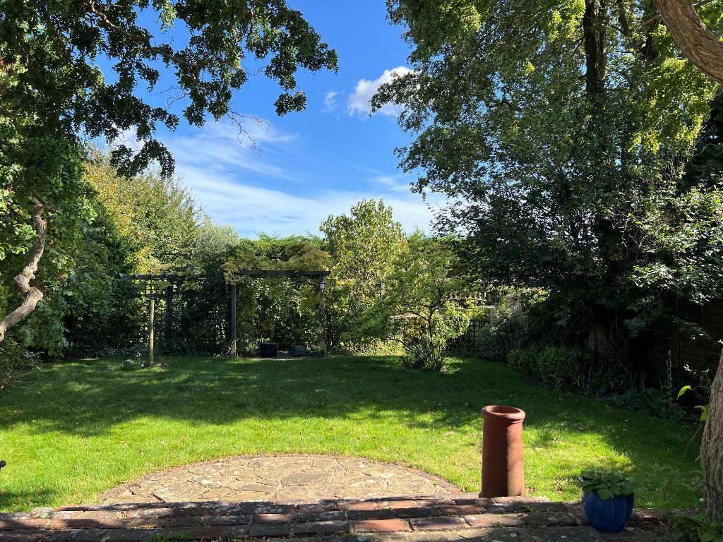 Rear Garden - Adjoining the rear of the house is a large tiled terrace with a decked section and timber steps down to a secluded rear garden with fenced boundaries to either side and an established line of leylandii on the rear boundary. From a further terraced level, brick-edged stone steps lead down to an area of lawn, enjoying a good degree of seclusion, and a wisteria-clad pergola with further trellis screening leads further to a small secret garden with productive apple tree and an ideal location for a vegetable garden or garden office structure.