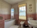 Spacious Bathroom - White suite of panelled bath with Mira shower unit and glazed shower guard. Bidet. Pedestal basin and low-level WC. Double radiator. Linen cupboard housing factory-lagged hot tank with fitted immersion heater and slatted shelving over.