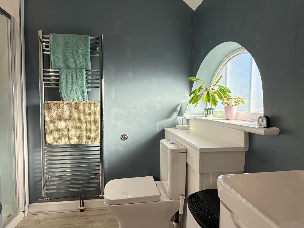 En-suite Shower Room - Wide shower recess with Aquabord walls and sliding doors, mixer bar, hand shower and drench head. Contemporary washstand with basin, mixer taps, pop-up waste and storage beneath. Low-level WC. Feature arch window. Chromium towel rail. Recessed ceiling lighting.