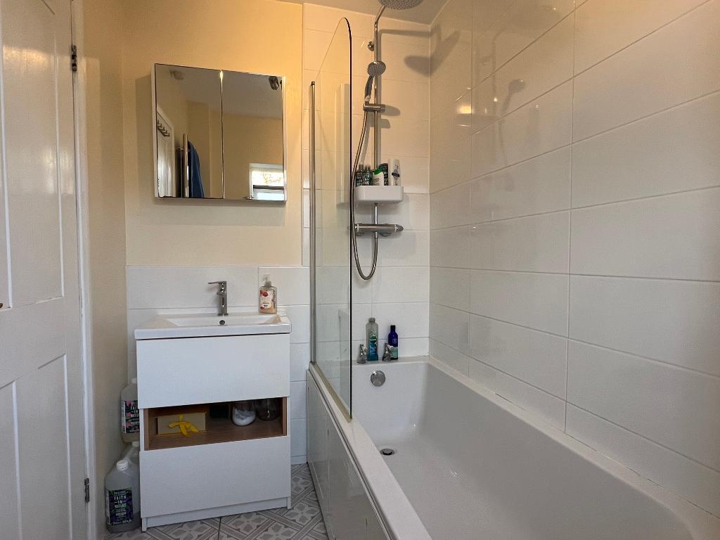 Modern white suite of panelled bath with glazed shower guard, shower bar with hand shower and drench head. Washbasin with mixer tap and cupboard and drawer beneath. Low-level WC. Chromium towel rail. Tiled flooring.