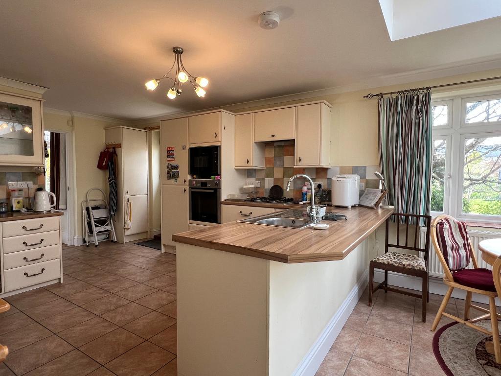 Kitchen Area with comprehensive range of wood-effect worktops with inset single-drainer stainless steel sink unit. Fitted cupboards. Deep pan drawers. Integrated dishwasher. Inset four-ring gas hob. Tall unit housing electric oven with adjoining integrated fridge/freezer. Further worktop with fitted drawers and display cabinet over.